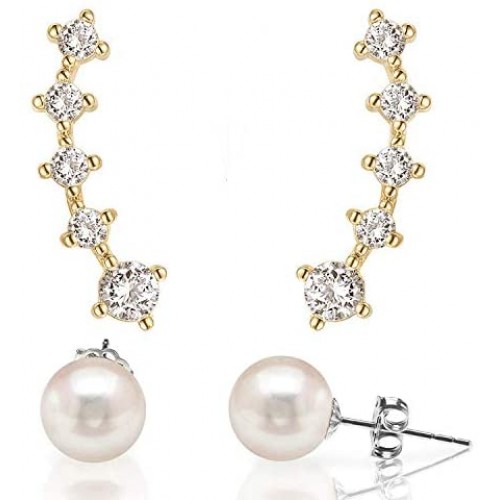 FREE Pearl Earrings With 14K Gold Plated Sterling Silver Post Crawler Earring Cuff Climber Earrings